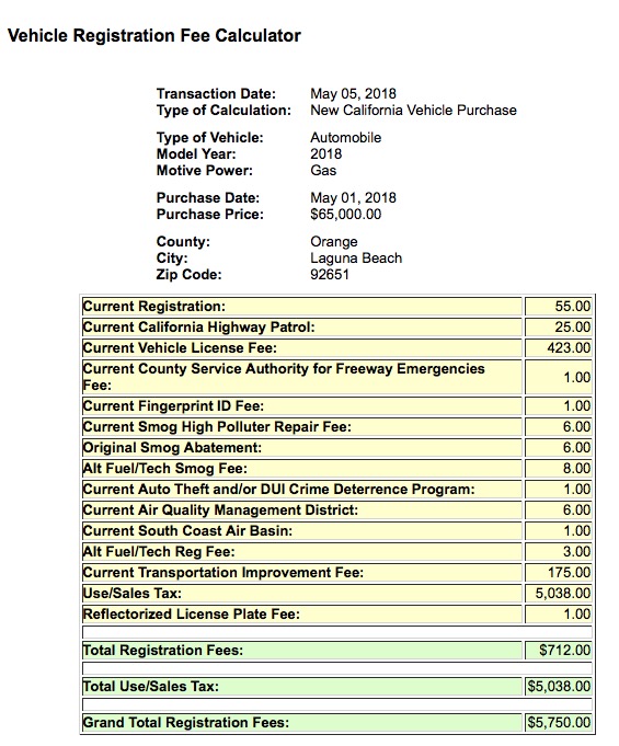 Transaction Date: May 05, 2018 Type of Calculation: New California Vehicle Purchase Type of Vehicle: Automobile Model Year: 2018 Motive Power: Gas Purchase Date: May 01, 2018 Purchase Price: $45,000.00 County: Orange Zip Code: 92688 Current Registration: 55.00 Current California Highway Patrol: 25.00 Current Vehicle License Fee: 293.00 Current County Service Authority for Freeway Emergencies Fee: 1.00 Current Fingerprint ID Fee: 1.00 Current Smog High Polluter Repair Fee: 6.00 Original Smog Abatement: 6.00 Alt Fuel/Tech Smog Fee: 8.00 Current Auto Theft and/or DUI Crime Deterrence Program: 1.00 Current Air Quality Management District: 6.00 Current South Coast Air Basin: 1.00 Alt Fuel/Tech Reg Fee: 3.00 Current Transportation Improvement Fee: 150.00 Use/Sales Tax: 3,488.00 Reflectorized License Plate Fee: 1.00 Total Registration Fees: $557.00 Total Use/Sales Tax: $3,488.00 Grand Total Registration Fees: